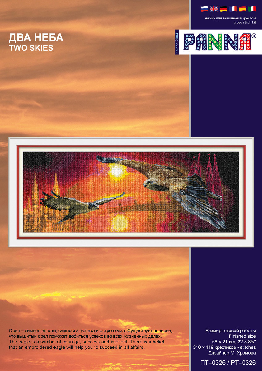 В наборы для вышивания " Panna" входят : канва " Gamma", нитки мулине " Gamma" на держателе, в часть наборов - бисер Чехия и/ или ленты для вышивания " Gamma", игла " Gamma", схема, инструкция по вышиванию. Орел - символ власти, смелости, успеха и острого ума. Существует поверье, что вышитый орел поможет добиться успехов во всех жизненных делах.