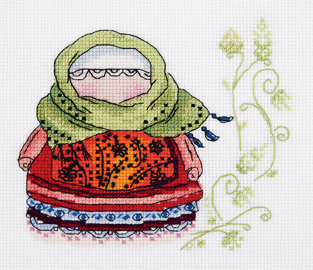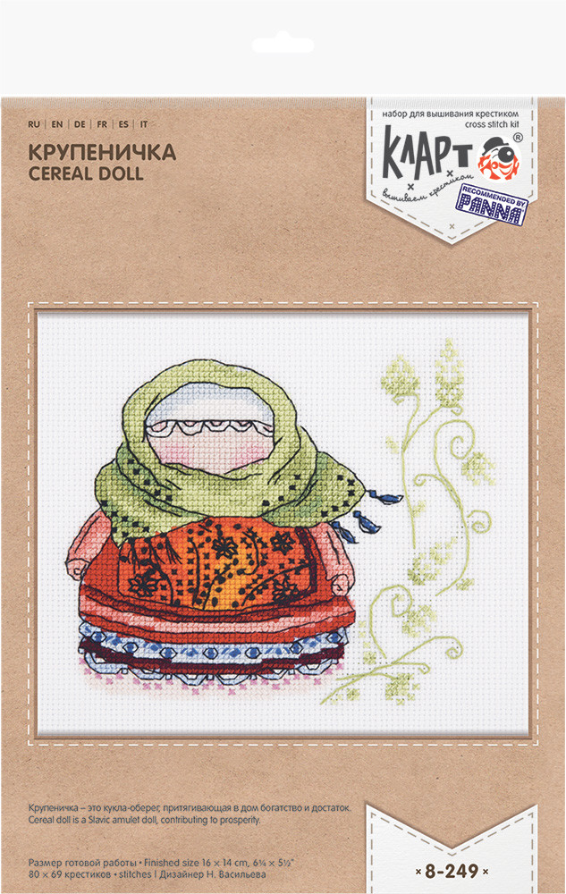 В набор для вышивания Klart входит: канва аппретированная " Gamma" К16, хлопчатобумажные нитки мулине " Gamma" на держателе, специализированная игла с тупым концом " Gamma" для вышивания, подробная инструкция по вышиванию и схема. По мотивам картины художника Ковалевой Т. Крупеничка – это кукла- оберег, притягивающая в дом богатство и достаток.