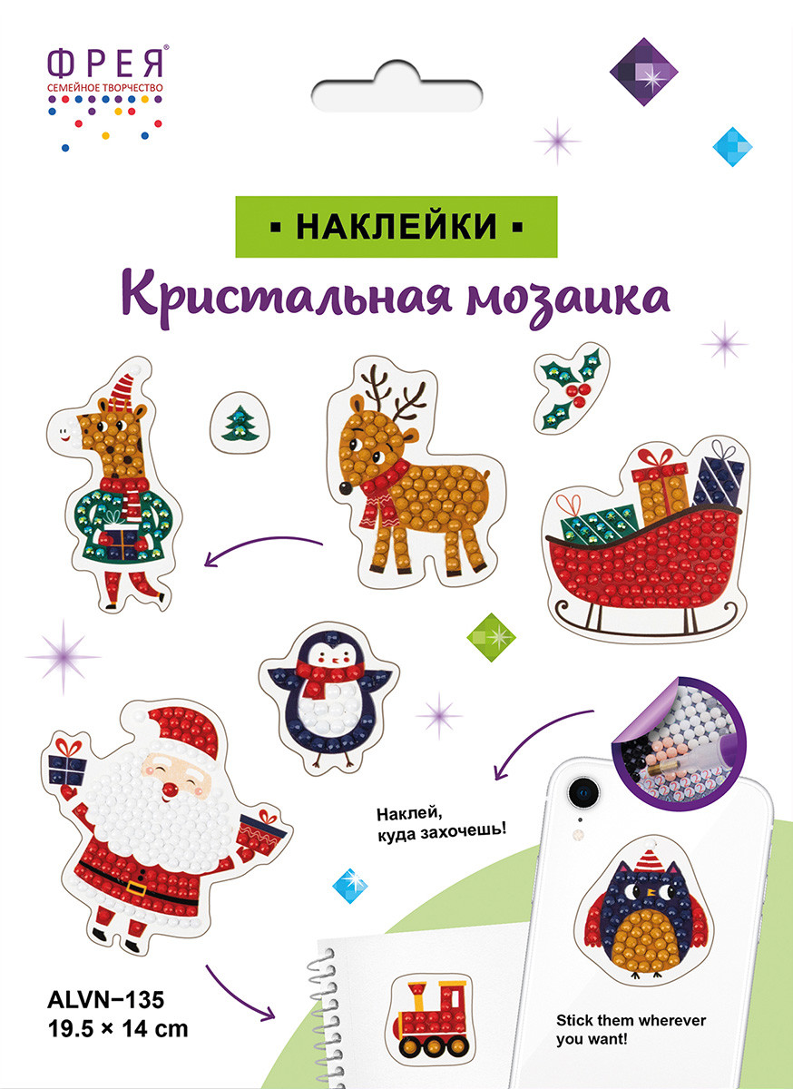Набор по изготовлению наклеек в технике " Кристальная/ алмазная мозаика". Выполнение работы не требует специальных навыков, выкладывать наклейки очень легко и быстро. Стразы наклеиваются поверх изображения со схемой на уже нанесенный клеевой слой. Увлекательный процесс создания изделий поможет развить мелкую моторику и повысить концентрацию внимания. Готовыми наклейками с яркими стразами можно украсить любую ровную поверхность, например блокнот, тетрадь, телефон и многое другое. В набор ТМ ФРЕЯ " Кристальная мозаика" входит:- один лист с несколькими небольшими наклейками, с напечатанными на них схемами для приклеивания страз и клеевым слоем с защитной плёнкой,- стилус и восковая подушечка,- круглые стразы: 5 цветов, запас более 30%- картонный лоток, - инструкция. Тип выкладки: частичная. Уровень сложности: 1 из 3. Размер готового изделия: 14 х 19. 5 см. Размер упаковки: 1х16, 3х22, 5см. Набор сертифицирован для детского творчества. Сообщить о неточности в описании